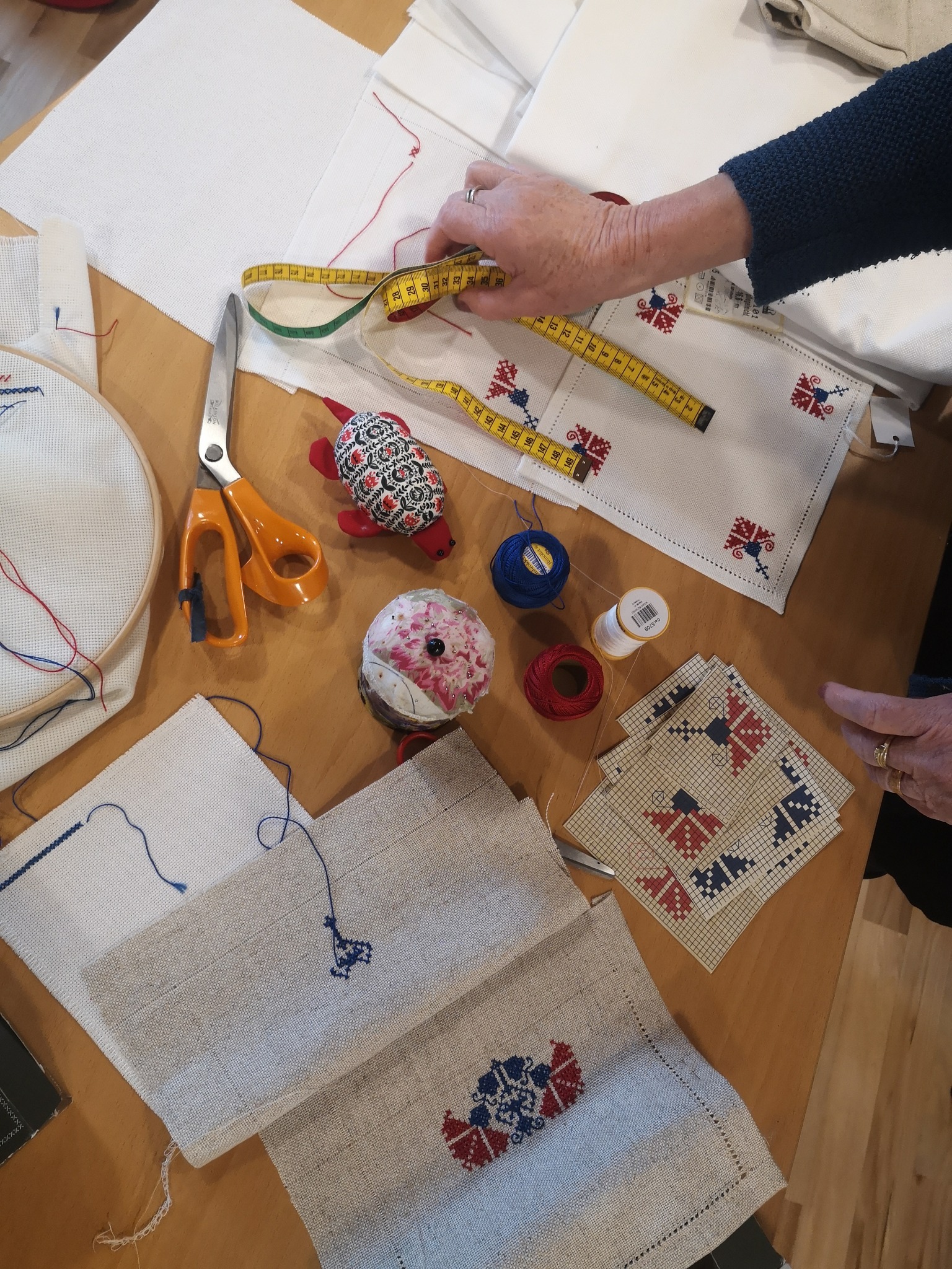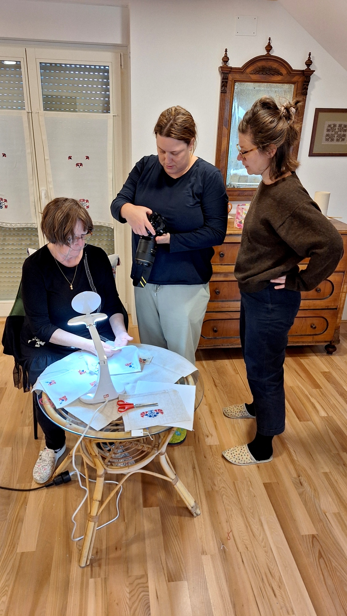 Terensko delo pri mojstrici vezenja po štetih niti Rozaliji Strojan.