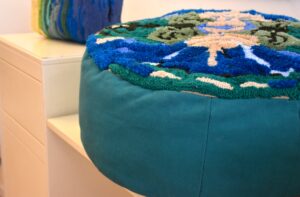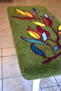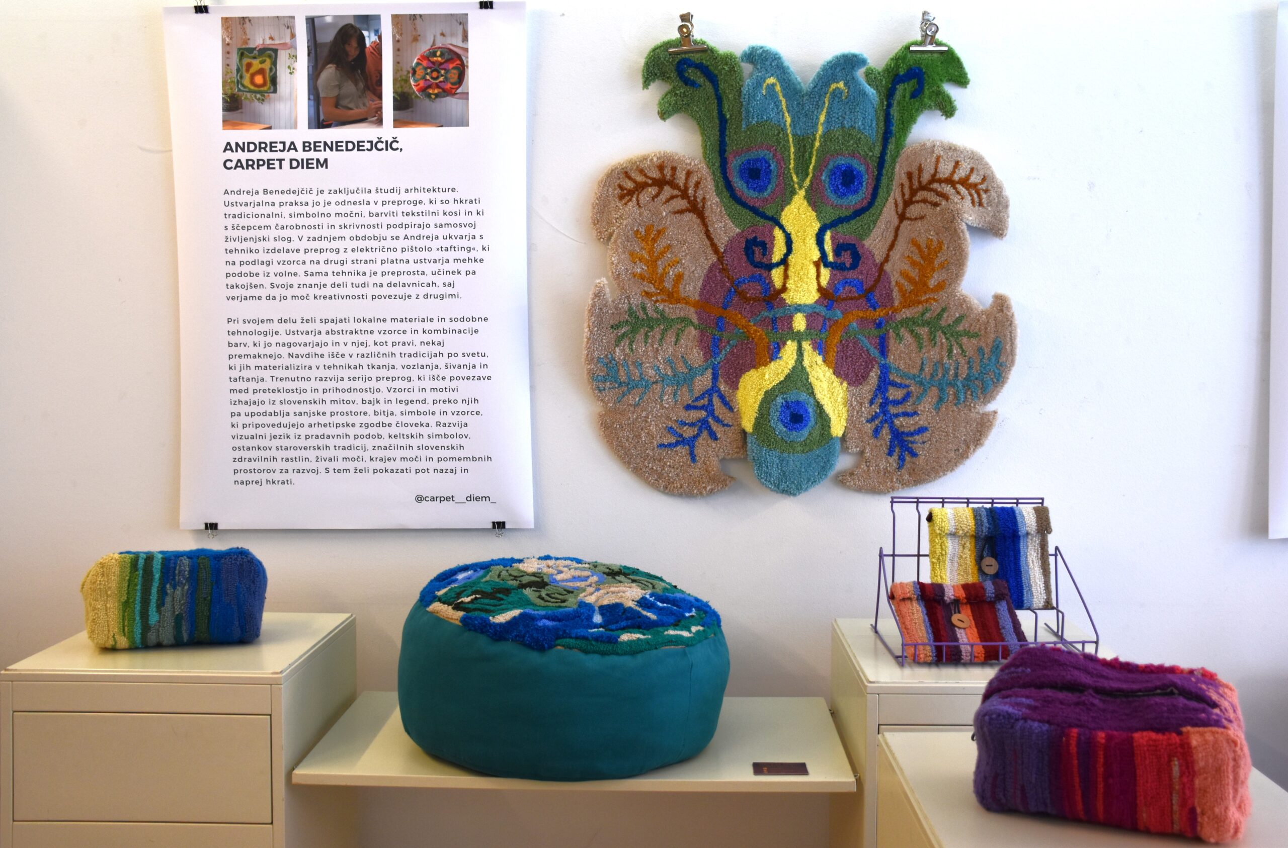 Andreja Benedejčič (Carpet Diem) je zaključila študij arhitekture. Ustvarjalna praksa jo je odnesla v preproge, ki so hkrati tradicionalni, simbolno močni, barviti tekstilni kosi in ki s ščepcem čarobnosti in skrivnosti podpirajo samosvoj življenjski slog. V zadnjem obdobju se Andreja ukvarja s tehniko izdelave preprog z električno pištolo »tafting«, ki na podlagi vzorca na drugi strani platna ustvarja mehke podobe iz volne. Sama tehnika je preprosta, učinek pa takojšen. Svoje znanje deli tudi na delavnicah, saj verjame da jo moč kreativnosti povezuje z drugimi.