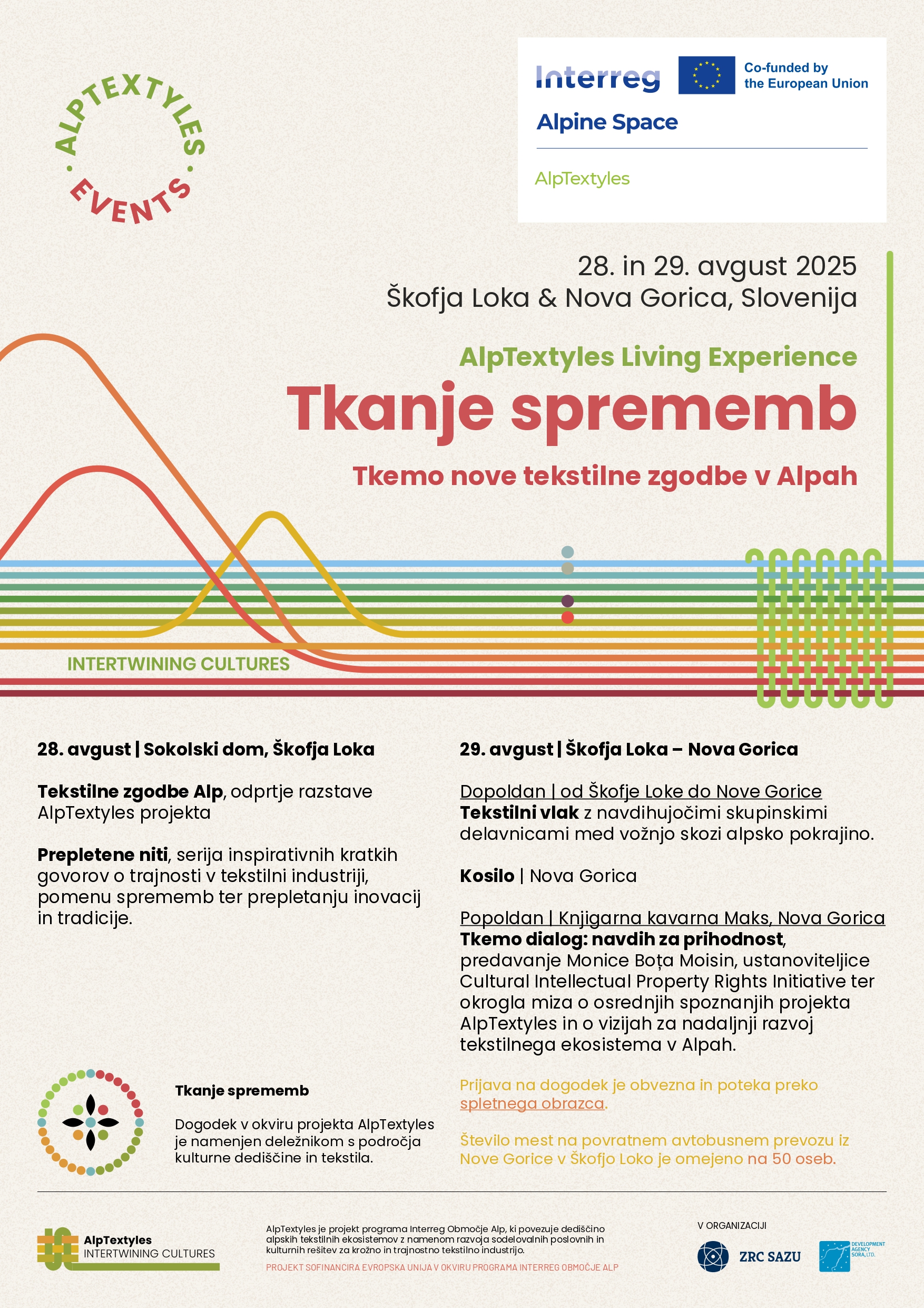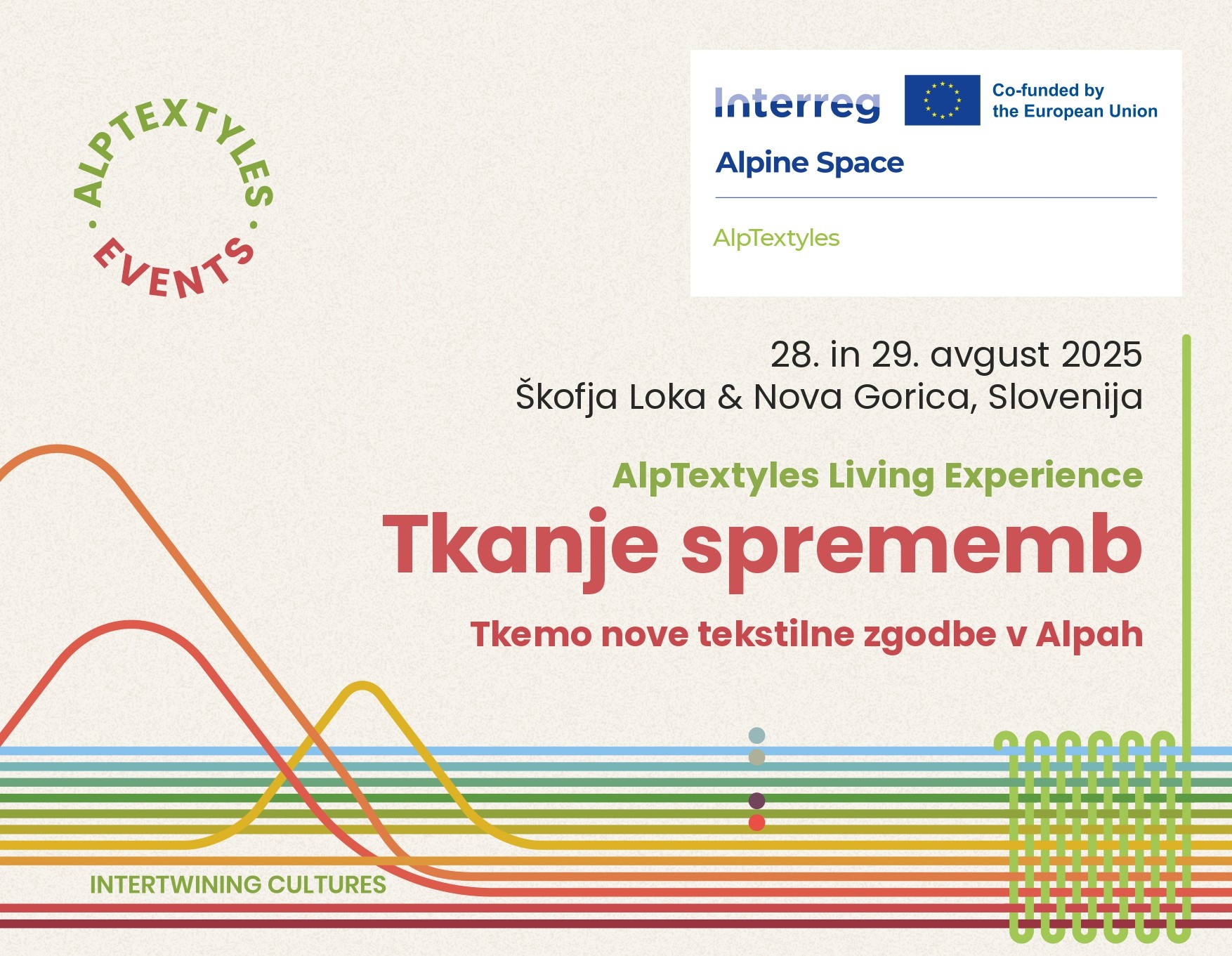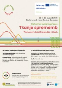 V okviru projekta AlpTextyles je 28. in 29. avgusta potekal dvodnevni dogodek Tkanje sprememb. V Škofji Loki in Novi Gorici je povezal razstavo, kratka predavanja, delavnice in še več, na temo tekstilne prihodnosti v Alpah.