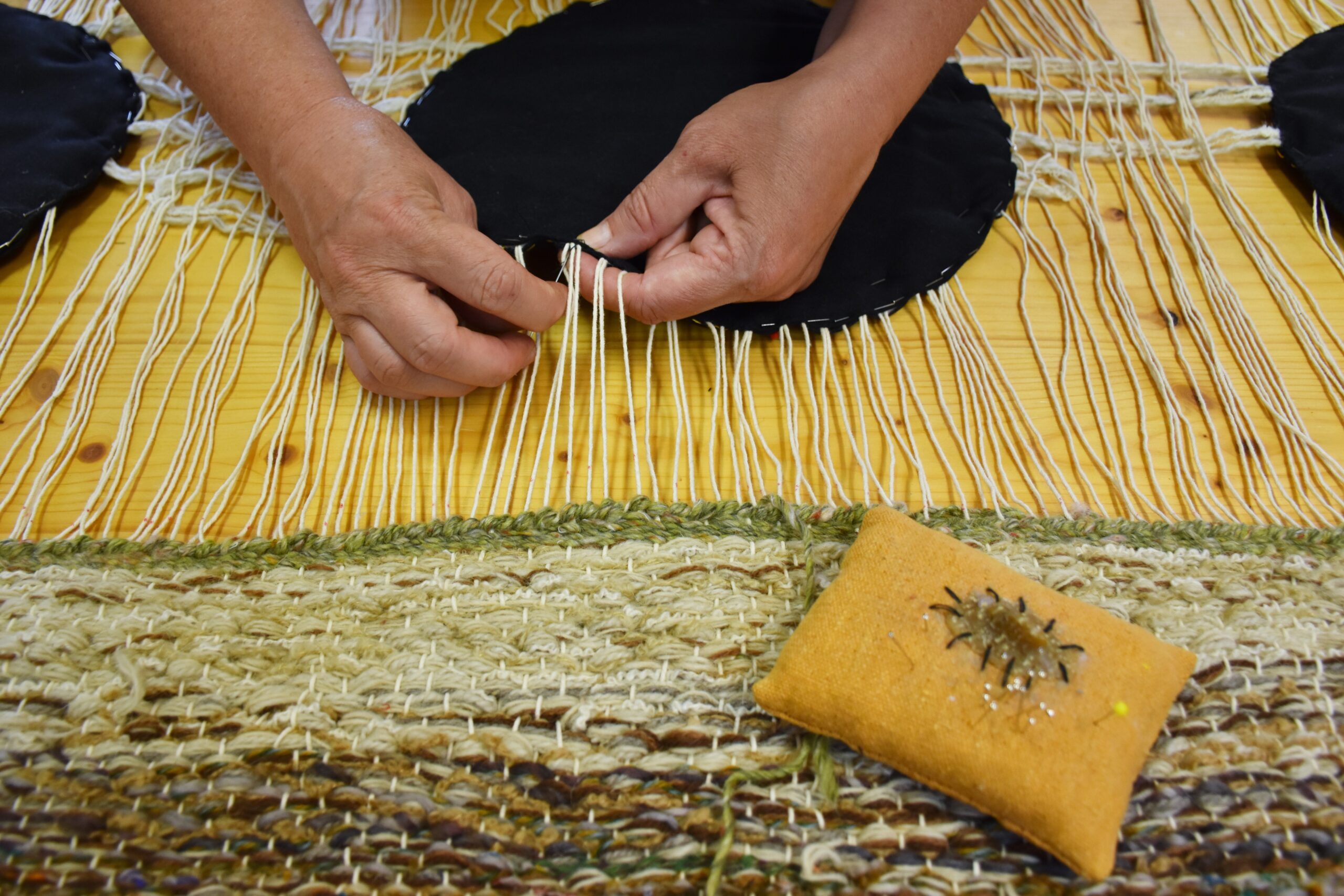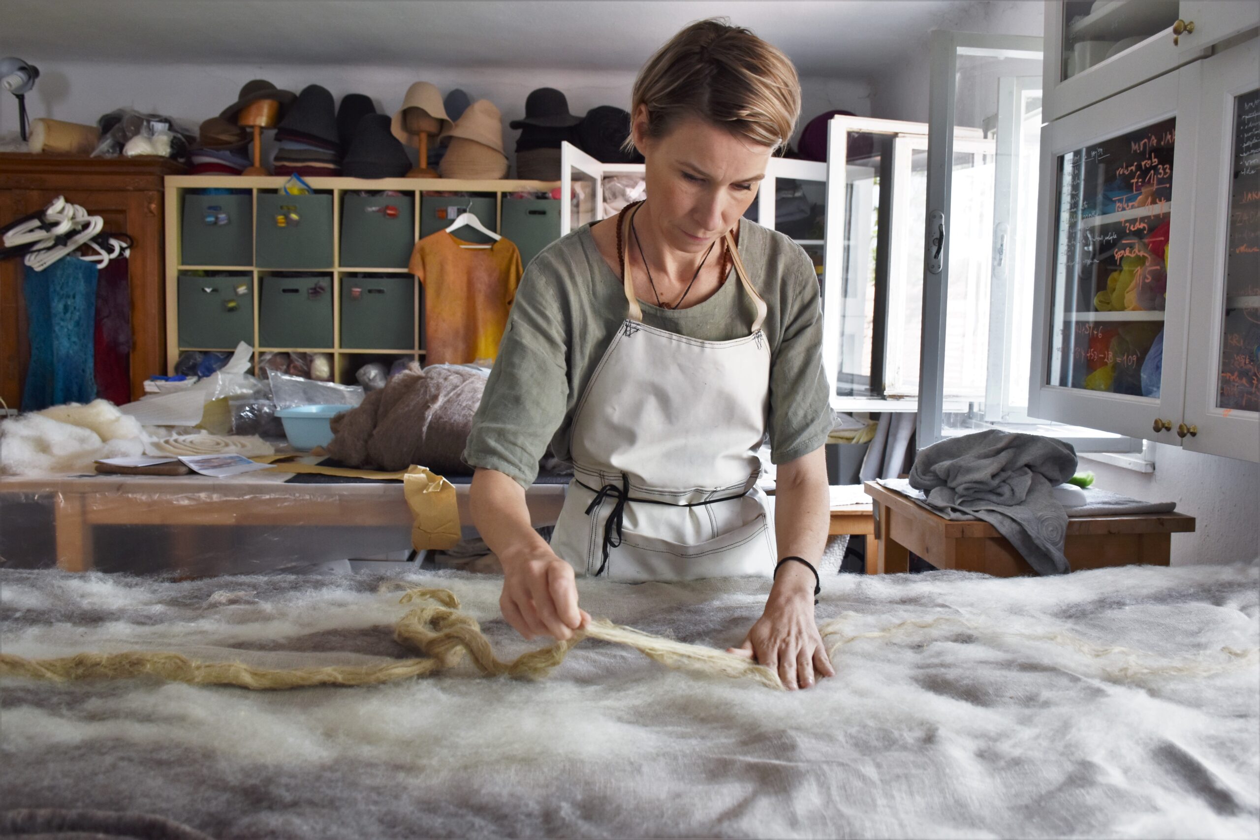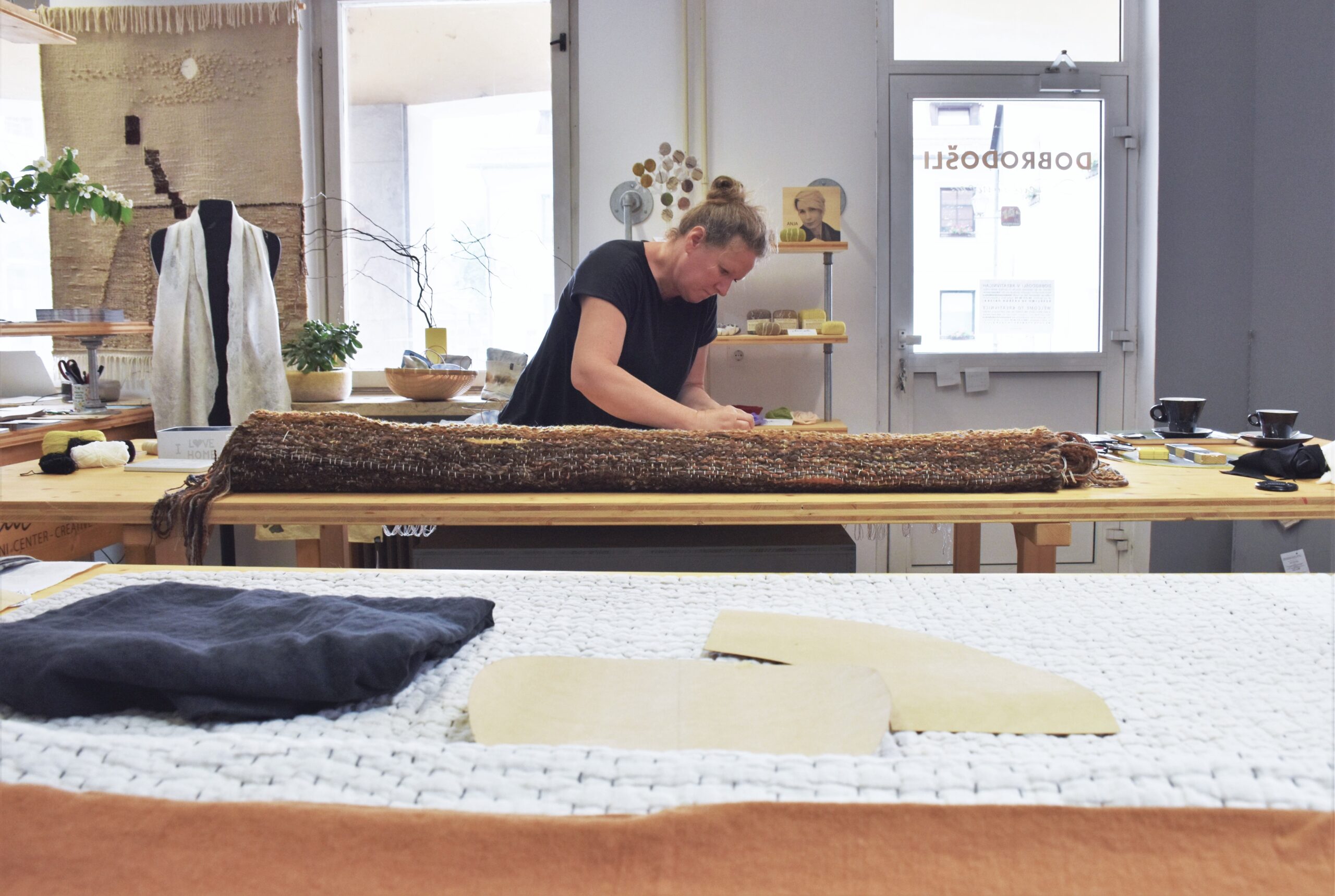 The four artists have paired their knowledge and expressiveness with the nobility of fertile soil and the above-ground world, which overgrows, protects and feeds on this very soil. Each of them used her distinctive technique – from weaving, felting, plant dyeing and botanical printing to quilting linen fabrics – and signature expressive style. Their joint work is enhanced with the artists’ individual works: Nina Vastl Štefe (The Black Seed), Anja Musek (Soil – Flax/Linen – Soil), Lili Panjtar (The New Life), Silva Horvat (The Corn Sun), which form a one-of-a-kind ecosystem.